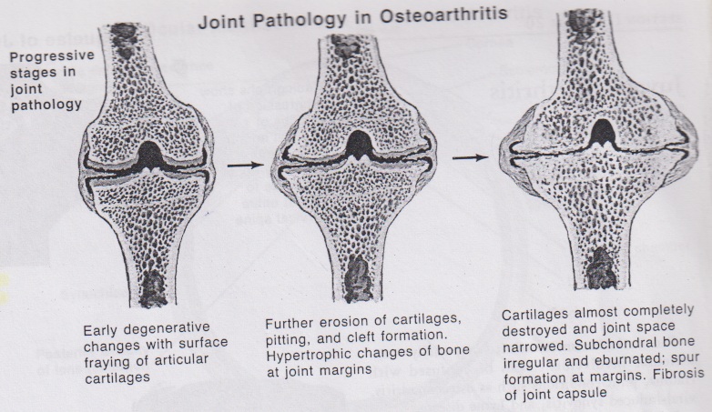 From the above mentioned book, he mentioned that “The most characteristic pathological feature is the growth of osteophytes at the margins of affected joints(nodule or spur formation). The osteophyte, which consists of bone growing from the joint margin, usually follows the contour of the articular surface with the capsule and ligamentous attachments; it may even grow into the joint space and be covered by cartilage that merges into the synovial lining.”