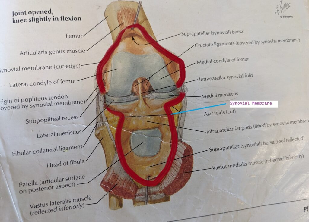 And as you can see the above diagram, you can see the synovial membrane, which is relieving the lubricants of the knee joint. If you have no problem, your knee joint is not swollen, not tight. However, if your knee joint is swollen, heat, redness, and tight, it is showing that you have some inflammation, especially on the synovial membrane which is showing the red lines along the joint capsule.