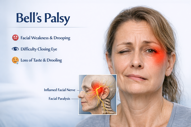 Bell’s Palsy is distressful disease which is one side of face is dropped and numb feeling and/or pain with inability to control the affected side of facial muscles. It is “a type of facial paralysis that results in a temporary inability to control the facial muscles on the affected side of the face.[1] Symptoms can vary from mild to severe.[1] They may include muscle twitching, weakness, or total loss of the ability to move one, and in rare cases, both sides of the face.[1] Other symptoms include drooping of the eyelid, a change in taste, and pain around the ear.”