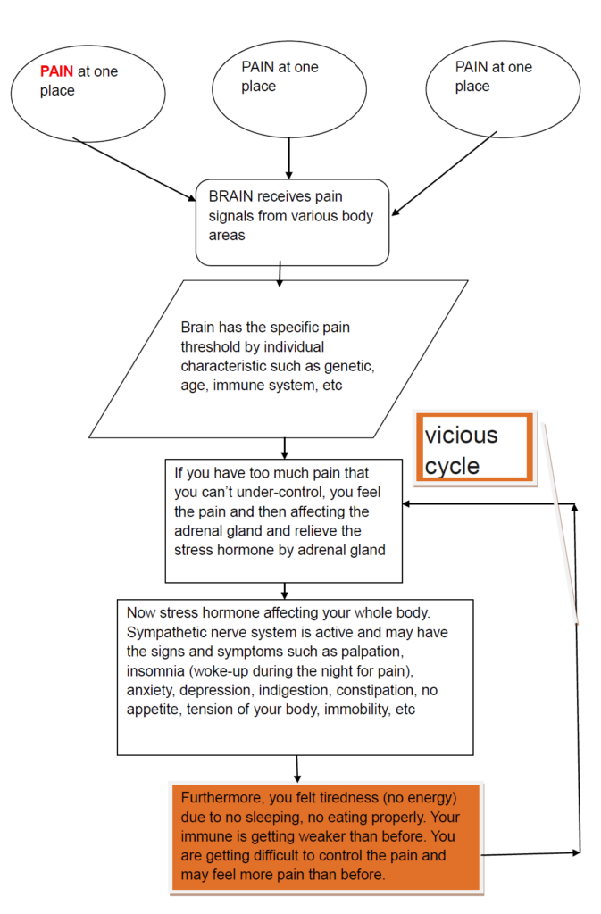 Mental Pain is coming from stress reaction due to chronic pain. When pain is lingering, leading to chronic, you are getting trouble with mental problem. Physical pain is making stress to your body, leading to increas-ing stress hormone such as cortisol affecting sleeping, furthermore, make you tiredness due to sleep quality, leading to weakness of immune sys-tem. Therefore, ability to fight with inflammation is getting weaker. You are feeling more painful than before. And pain is getting worse with time going on. If you feel tired, you may feel depressed and be anxious due to the fact that you can’t control your situation.